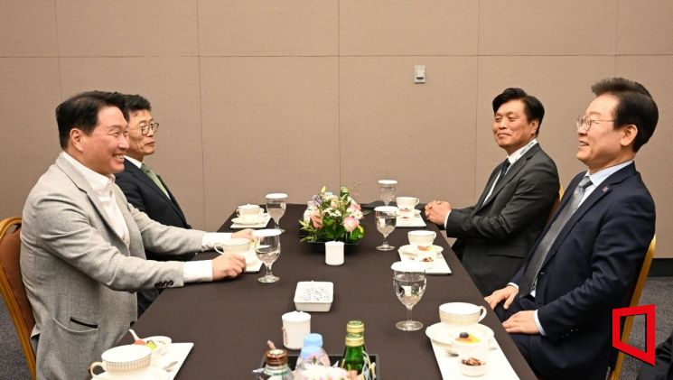 이재명 더불어민주당 대표와 최태원 SK그룹 회장이 4일 서울 강남구 삼성동 코엑스에서 열린 SK AI 서밋 참석에 앞서 차담회를 하고 있다. 국회사진기자단