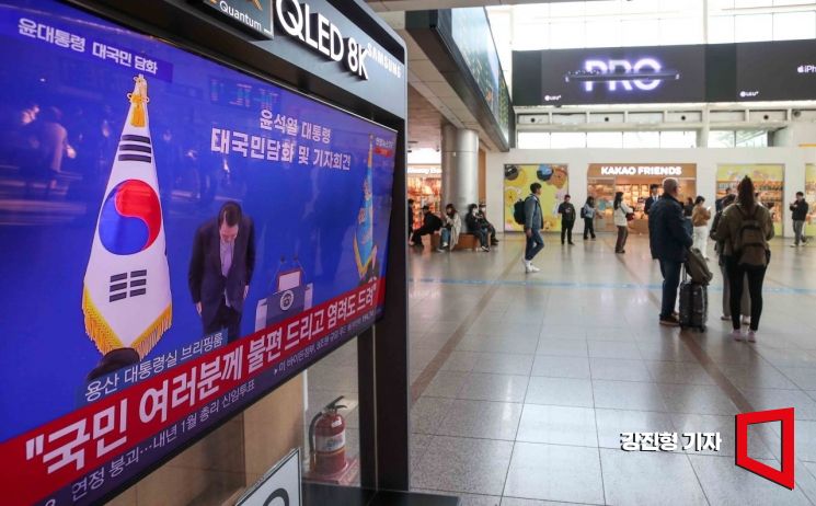 7일 서울 용산구 서울역 대합실에서 윤석열 대통령의 대국민 담화가 중계되고 있다. 대통령실은 대국민담화 뒤 기자회견에서 시간이 길어지더라도 질문이 더 나오지 않을 때까지 질의응답을 이어가겠다고 밝혔다.