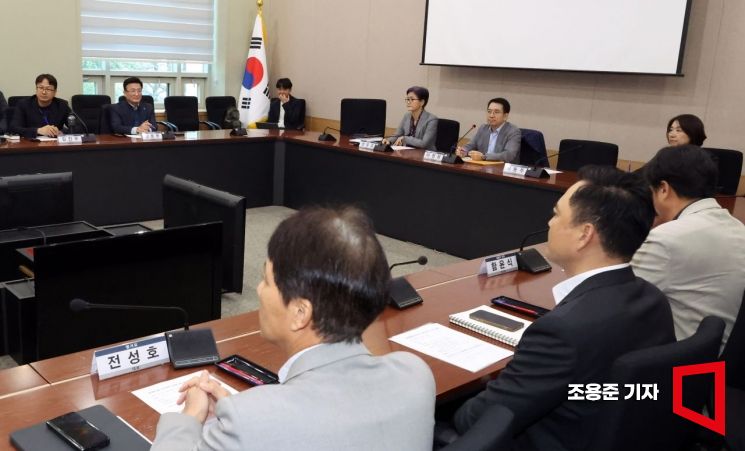 7일 서울 종로구 정부서울청사 별관에서 열린 배달플랫폼-입점업체 상생협의체 회의에 참석한 이정희 위원장을 비롯한 위원들이 회의 시작을 기다리고 있다. 이날 회의에는 배달의 민족, 쿠팡이츠, 요기요, 땡겨요 등 플랫폼사를 비롯해 입점업체, 공익위원들이 상생방안을 논의했다.
