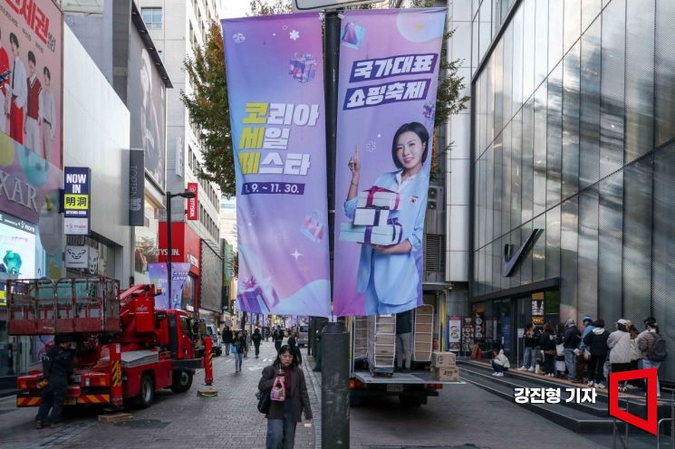 코리아세일페스타 시작을 하루 앞둔 8일 서울 중구 명동거리에 코리아세일페스타를 알리는 현수막이 걸려 있다. 오는 9일부터 30일까지 진행되는 코리아세일페스타는 대형마트, 백화점, 온라인 쇼핑몰뿐 아니라 가전, 자동차 등 주요 제조업체들이 참여하며 소비 활성화를 위한 국가적 쇼핑행사로 기대를 모으고 있다.