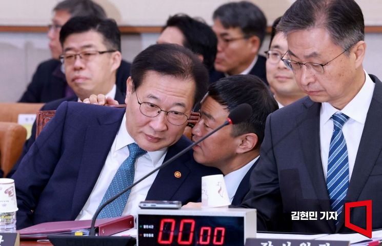 박성재 법무부 장관이 8일 국회에서 열린 법제사법위원회 전체회의에서 관계자와 대화하고 있다.