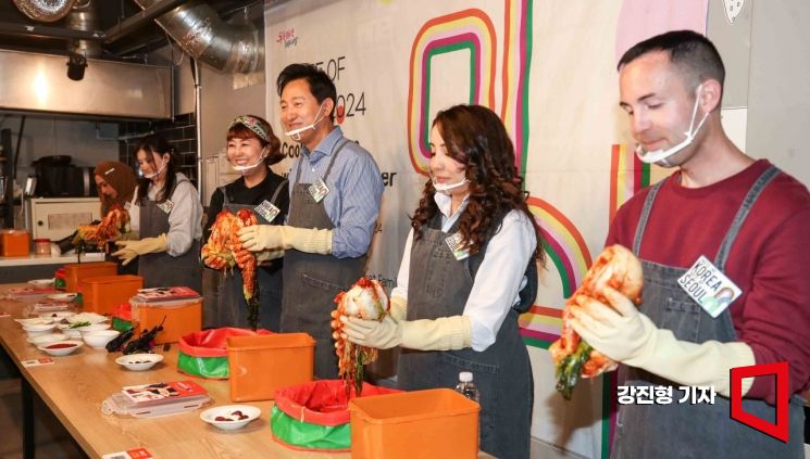 오세훈(오른쪽 세 번째) 서울시장이 8일 서울 동대문구 경동시장 청년몰에서 열린 '2024 서울미식주간-전통시장 투어 김치클래스'에 참석한 외국인들과 서울식 김치를 만든 뒤 사진촬영 하고 있다. 서울 미식 주간은 시내 120개 식당·카페가 일주일간 한정판 메뉴를 선보이는 행사로 참여하는 식당·카페 수가 작년(67개)보다 2배로 늘어났다.