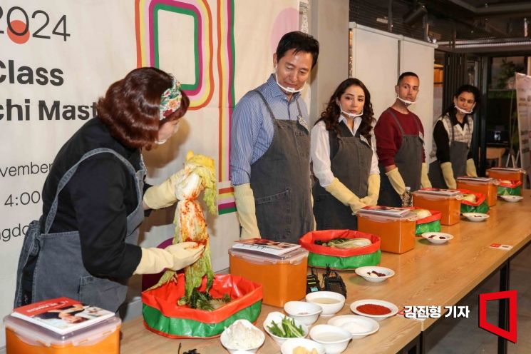 오세훈 서울시장과 외국인들이 8일 서울 동대문구 경동시장 청년몰에서 열린 '2024 서울미식주간-전통시장 투어 김치클래스'에 참석해 요리연구가 홍신애에게 서울식 김치 만드는 방법을 듣고 있다. 서울 미식 주간은 시내 120개 식당·카페가 일주일간 한정판 메뉴를 선보이는 행사로 참여하는 식당·카페 수가 작년(67개)보다 2배로 늘어났다.
