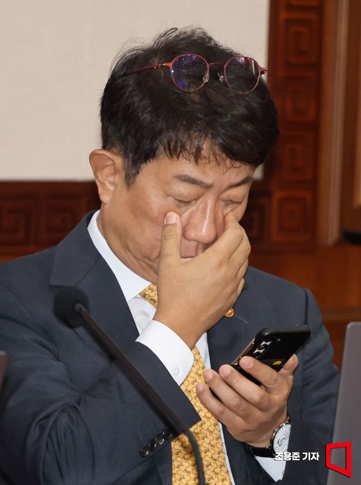 박상우 국토교통부 장관이 12일 서울 종로구 정부서울청사에서 열린 국무회의에 참석, 휴대폰을 보고 있다.