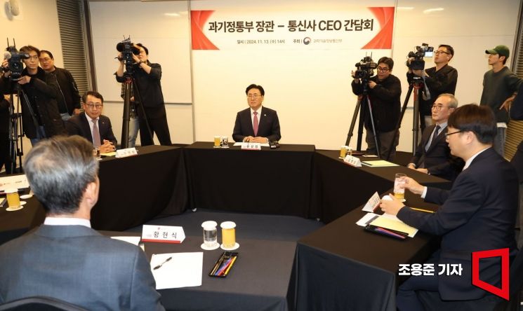유상임 과학기술정보통신부 장관이 13일 서울 중구 대한상공회의소에서 열린 과기정통부 장관-통신사 CEO 간담회에서 발언하고 있다. 이날 간담회에는 김영섭 KT 대표, 유영상 SK텔레콤 대표, 황현식 LG유플러스가 참석했다.
