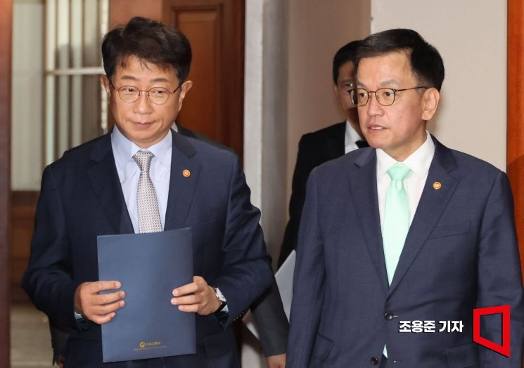 최상목 경제부총리 겸 기획재정부 장관(오른쪽)과 박상우 국토교통부장관이 14일 서울 종로구 정부서울청사에서 열린 경제관계장관회의에 참석하고 있다. 이날 회의에선 부동산 PF 제도개선방안 및 부진한 내수 회복 지원 방안 등을 논의한다.