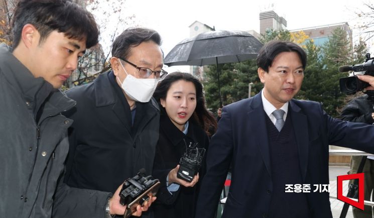 친인척 부당대출 의혹을 받고 있는 손태승 전 우리금융지주 회장이 26일 서울 양천구 서울남부지방법원에서 열린 특정경제범죄 가중처벌법상 배임 혐의 관련 구속 전 피의자 심문(영장실질심사)을 받기 위해 법정에 출석하고 있다.