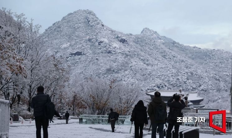 서울 전역에 많은 눈이 내린 27일 서울 종로구 북악산이 하얗게 내린 눈으로 덮히자 출근길 직장인들이 휴대폰에 풍경을 담고 있다.