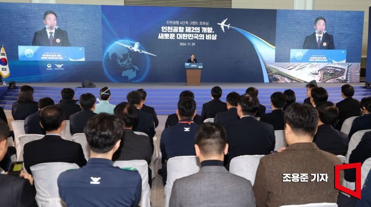 29일 인천 영종도 인천공항제2여객터미널에서 열린 제2여객터미널(T2) 4단계 확장시설 개장식에서 이학재 인천공항공사 사장이 환영사를 하고 있다. 공식운영은 종합시운전 등을 거쳐 내달 3일 시작한다.