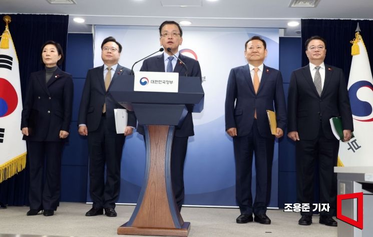 최상목 경제부총리 겸 기획재정부 장관이 2일 서울 종로구 정부서울청사에서 야당 단독 예산감액안의 문제점 등 정부 입장을 발표하고 있다. 이날 합동 브리핑에는 이상민 행정안전부장관, 조규홍 보건복지부 장관, 오영주 중소벤처기업부 장관, 방기문 국무조정실장이 참석했다.