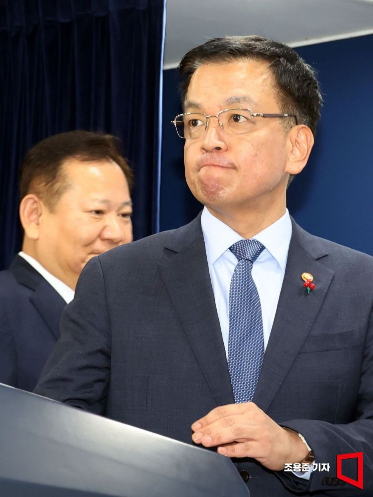 최상목 경제부총리 겸 기획재정부 장관이 2일 서울 종로구 정부서울청사에서 야당 단독 예산감액안의 문제점 등 정부 입장을 발표에 앞서 굳은표정을 하고 있다. 이날 합동 브리핑에는 이상민 행정안전부장관, 조규홍 보건복지부 장관, 오영주 중소벤처기업부 장관, 방기문 국무조정실장이 참석했다.