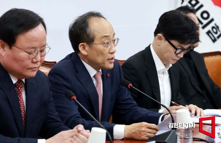 추경호 국민의힘 원내대표가 2일 국회에서 열린 최고위원회의에서 발언하고 있다.