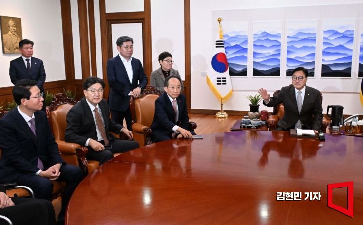 추경호 국민의힘 원내대표와 중진 의원들이 2일 우원식 국회의장실을 항의 방문해 감액 예산안 본회의 처리 등에 대한 반대 의견을 전달하고 있다.