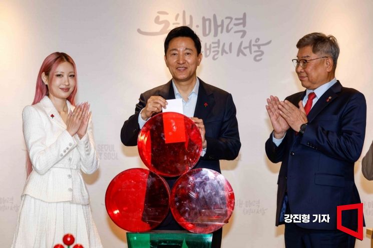 오세훈(왼쪽 두 번째) 서울시장이 2일 서울 중구 서울시청에서 열린 '희망2025 나눔캠페인 사랑의열매 전달식'에 참석해 성금을 모금함에 넣고 있다. 왼쪽부터 서울 사랑의열매 기부자 대표 크리에이터 이사배, 오세훈 서울시장, 김재록 서울 사랑의열매 회장.