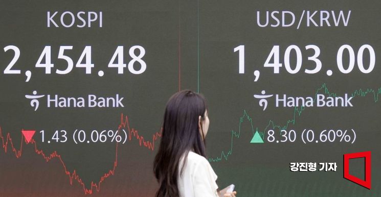 코스피 지수가 전 거래일 대비 1.43포인트(0.06%) 내린 2454.48에 장을 마친 2일 서울 중구 하나은행 본점 딜링룸에서 딜러들이 업무를 보고 있다. 이날 원달러 환율의 주간 거래 종가는 전 거래일보다 6.6원 오른 1401.3원을 기록했다. 강진형 기자