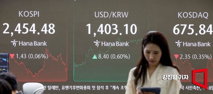 코스피 지수가 전 거래일 대비 1.43포인트(0.06%) 내린 2454.48에 장을 마친 2일 서울 중구 하나은행 본점 딜링룸에서 딜러들이 업무를 보고 있다. 이날 원달러 환율의 주간 거래 종가는 전 거래일보다 6.6원 오른 1401.3원을 기록했다.