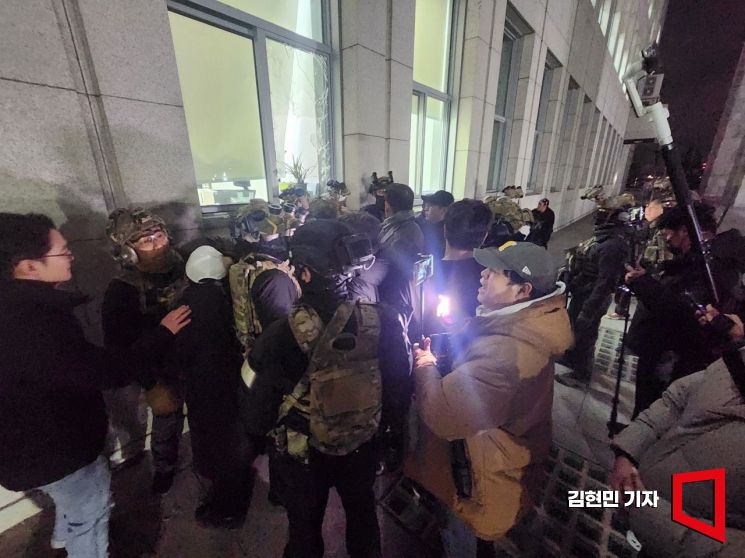 4일 국회의사당 본관에 계엄군 20여명이 국회 본관 진입을 시도하다 시민들과 대치하고 있다. 김현민 기자