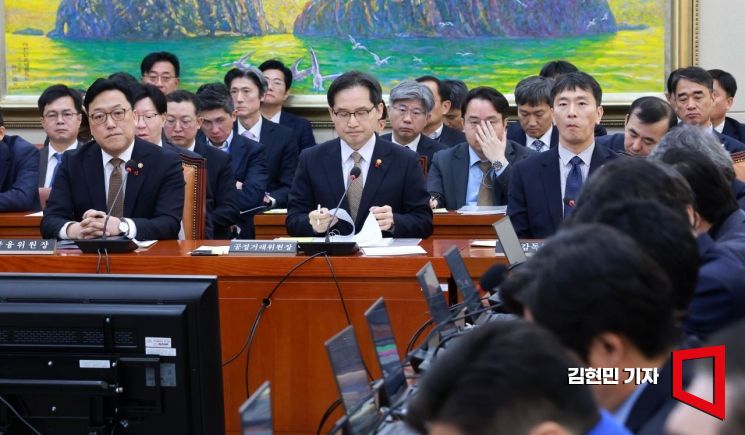 김병환 금융위원장(왼쪽부터)과 한기정 공정위원장, 이복현 금감원장이 18일 국회 정무위원회에서 열린 금융당국에 대한 긴급 현안질의에 참석하고 있다.