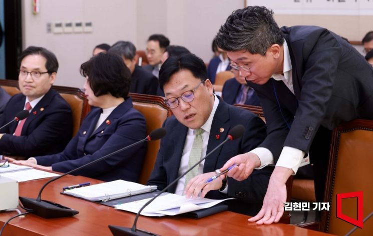 김병환 금융위원장이 24일 국회에서 열린 법제사법위원회 전체회의에서 관계자와 대화하고 있다.