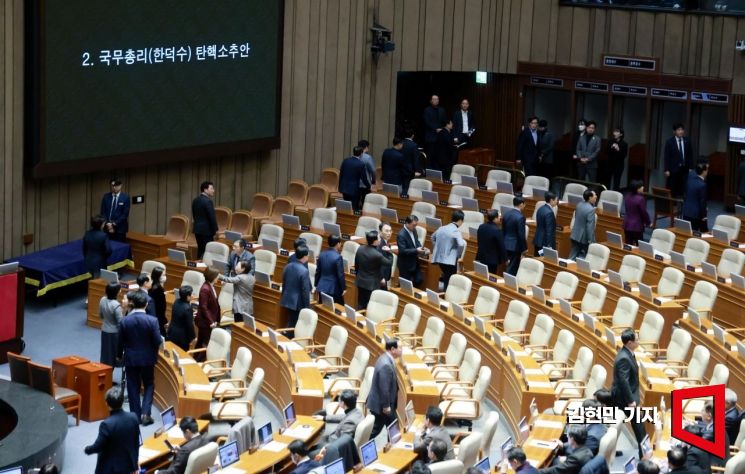 국민의힘 의원들이 27일 한덕수 국무총리 탄핵소추안 표결이 진행된 국회 본회의에서 우원식 국회의장에게 집단 항의한 뒤 회의장을 나서고 있다.