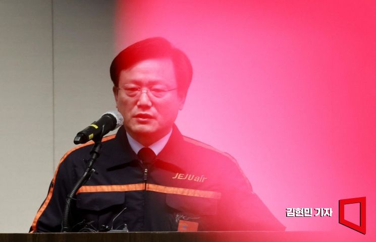 김이배 제주항공 대표가 29일 서울 강서구 메이필드 호텔에서 무안국제공항 여객기 참사 관련 브리핑을 하고 있다.