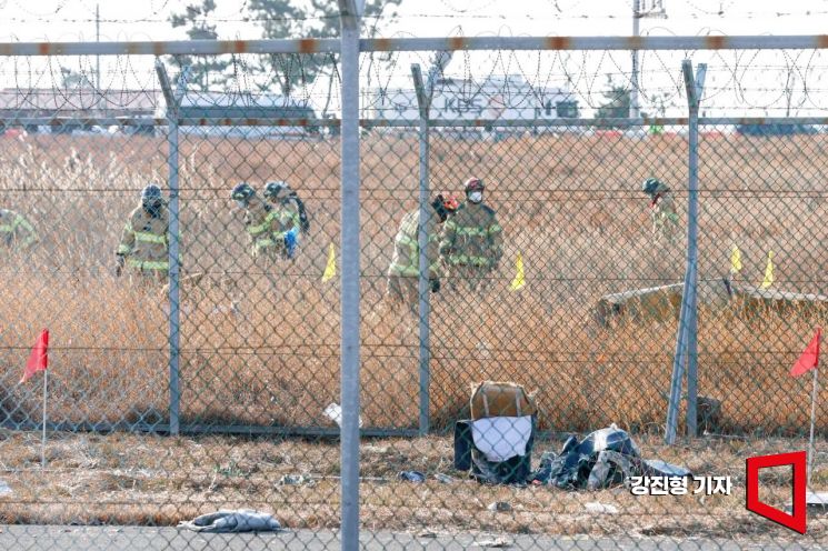 무안국제공항에서 탑승객 181명을 태운 제주항공 여객기가 착륙 중 활주로 외벽에 충돌한 뒤 화재가 발생해 승객 대부분이 사망하는 대참사가 발행한 29일 전남 무안국제공항 활주로 사고 현장에서 소방대원들이 잔해물을 수습하고 있다.