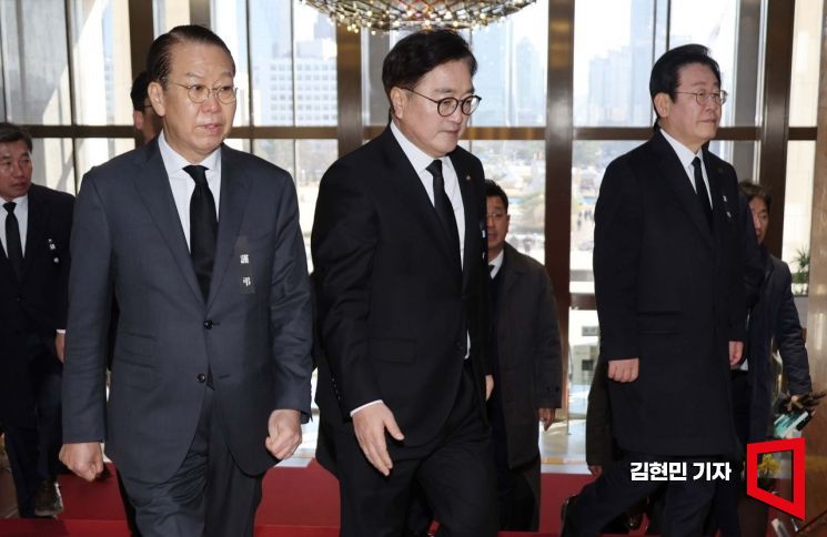 우원식 국회의장과 권영세 국민의힘 비상대책위원장, 이재명 더불어민주당 대표가 31일 국회에 마련된 제주항공 여객기 사고 희생자 합동 분향소를 조문한 뒤 회동 장소인 국회의장실로 이동하고 있다.