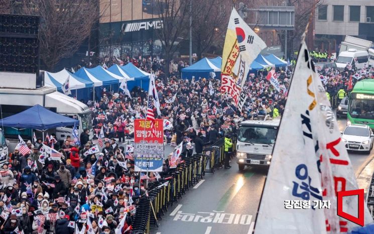고위공직자범죄수사처가 윤석열 대통령에 대한 체포영장 집행 관련 업무를 경찰에 일임하겠다는 공문을 발송한 6일 서울 용산구 대통령 관저 인근에 모인 보수단체 소속 관계자들이 윤 대통령 체포 반대를 촉구하고 있다.