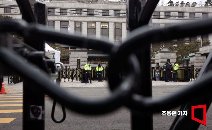 헌법재판소의 윤석열 대통령 탄핵심판 2차 변론기일인 16일 서울 종로구 헌법재판소 앞에서 경찰들이 출입을 통제하고 있다. 윤석열 대통령 측은 이날 오후 예정된 탄핵심판 2차 변론을 연기해달라고 헌재에 요청했다.