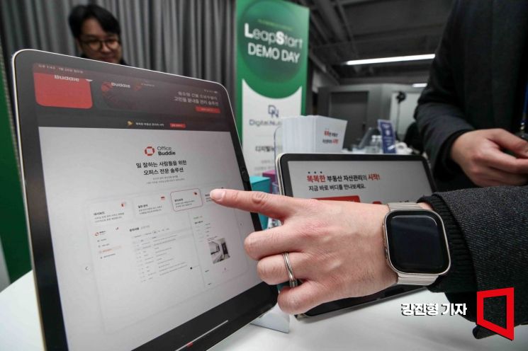 20일 서울 강남구 팁스타운 팁스홀에서 넥스트엘레베이션과 씨엔티테크가 주최한 '리프 스타트 데모 데이'에서 스타트업 '이십사쩜칠'이 기업소개를 하고 있다.