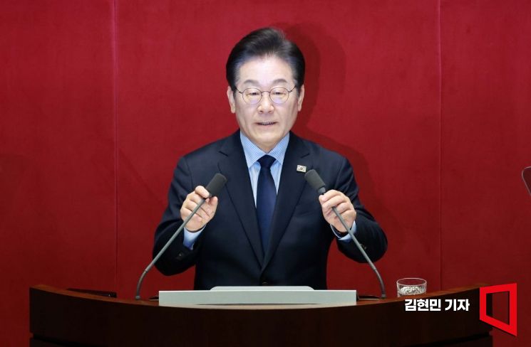 이재명 더불어민주당 대표가 10일 국회에서 열린 본회의에서 교섭단체 대표연설을 하고 있다.