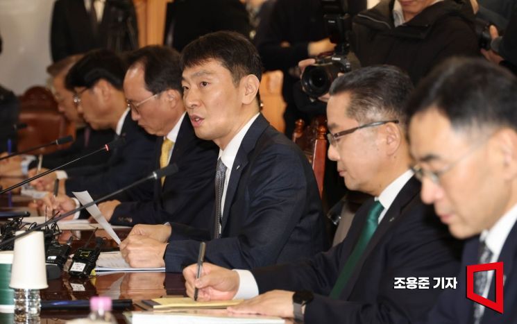 이복현 금융감독원장이 19일 서울 중구 은행회관에서 열린 시중은행장들과 간담회에 참석, 발언하고 있다. 올해 처음으로 은행장들과 만난 이 원장은 은행권의 내부통제와 가계부채 관리, 대출금리 등을 논의할 예정이다.
