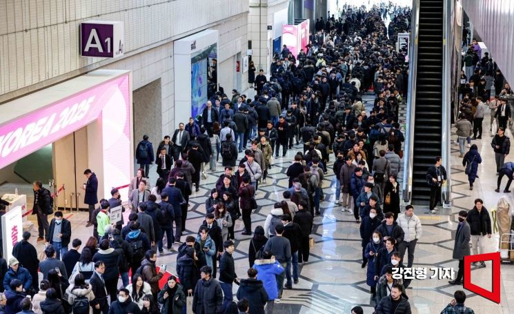 19일 서울 강남구 코엑스에서 열린 '세미콘 코리아 2025'를 찾은 국내외 바이어들이 입장 하기 위해 줄을 서고 있다.