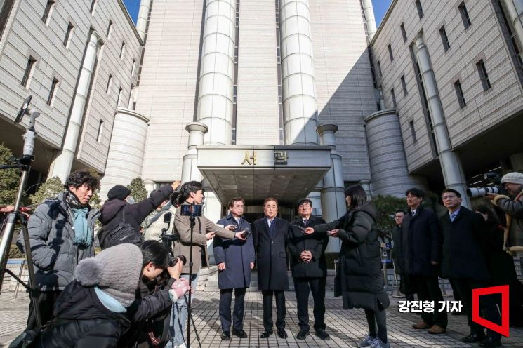 서훈 전 국가정보원장, 정의용 전 국가안보실장, 노영민 전 대통령 비서실장(왼쪽부터)이 19일 서울 서초구 서울중앙지방법원에서 열린 탈북 어민 강제북송 사건에 대한 1심 선고를 마친 뒤 입장 발표를 하고 있다. 이날 재판부는 정의용 전 국가안보실장과 서훈 전 국가정보원장에 징역 10개월의 선고 유예를 선고 했고, 노영민 전 대통령 비서실장에게 징역 6개월의 선고 유예를 선고 했다. 선고유예는 형의 선고를 미루고, 유예일로부터 2년이 지나면 사실상 없던 일로 해주는 판결이다.