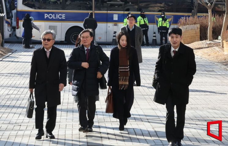 윤석열 대통령 변호인단이 20일 오전 서울 서초구 서울중앙지법에서 열리는 윤 대통령 첫 공판준비기일과 구속취소 심문기일에 참석하기 위해 법원에 들어서고 있다. 사진공동취재단