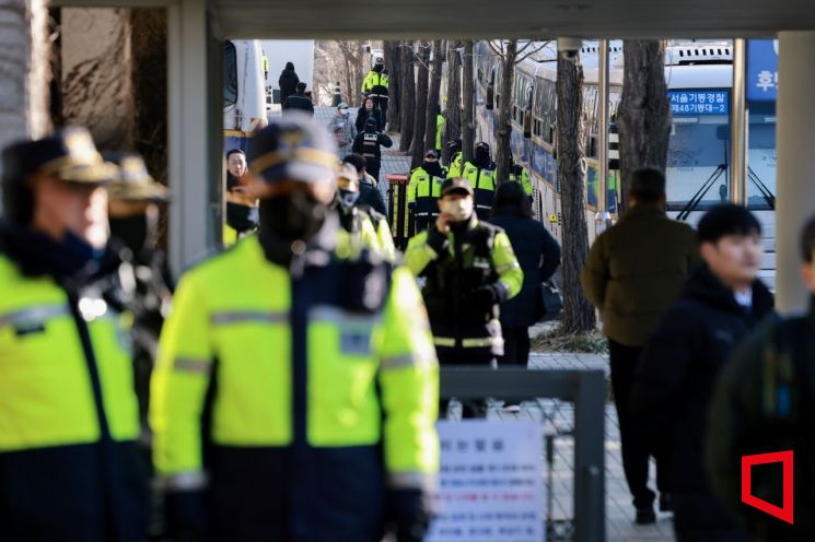 내란 우두머리 혐의를 받는 윤석열 대통령의 형사재판 첫 공판준비기일인 20일 서초동 서울중앙지방법원 청사의 보안이 강화돼 있다. 사진공동취재단