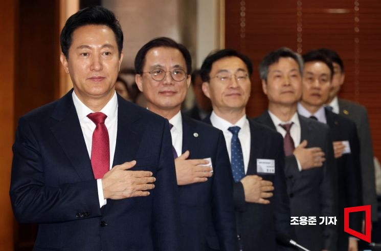 오세훈 서울시장이 24일 서울 중구 프레스센터에서 열린 제1차 서울혁신대학지원위원회 회의에 참석, 국민의례를 하고 있다.