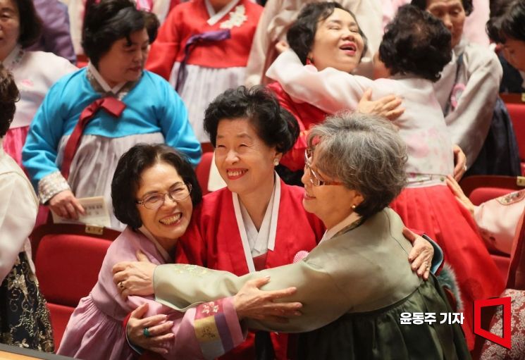 서울 마포아트센터에서 25일 열린 일성여자중고등학교 졸업식에서 졸업생들이 포옹을 하며 서로를 축하하고 있다. 일성여중고는 제때 학업을 마치지 못한 40대 이상 여성 만학도들이 중·고교 과정을 공부하는 2년제 학력인정 평생학교다.