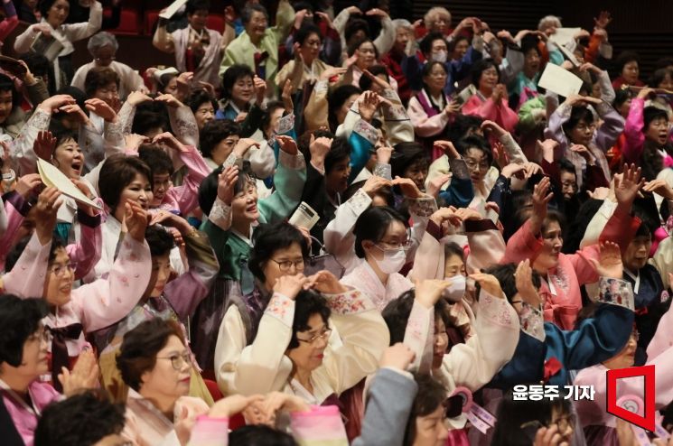 서울 마포아트센터에서 25일 열린 일성여자중고등학교 졸업식에서 졸업생들이 손으로 하트를 만들며 서로를 축하하고 있다. 일성여중고는 제때 학업을 마치지 못한 40대 이상 여성 만학도들이 중·고교 과정을 공부하는 2년제 학력인정 평생학교다.