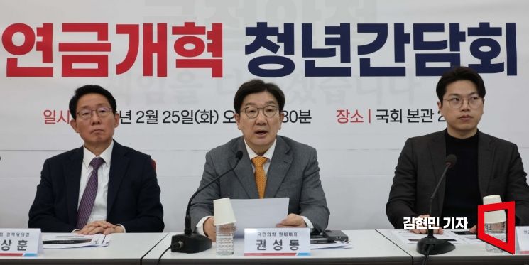 권성동 국민의힘 원내대표가 25일 국회에서 열린 연금개혁 청년간담회에서 발언하고 있다.