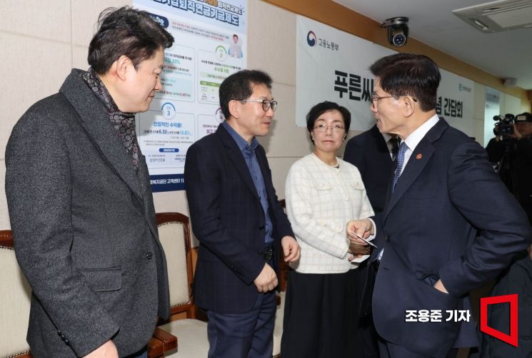 김문수 고용노동부 장관이 26일 서울 영등포구 근로복지공단 서울합동청사에서 열린 중소기업퇴직연금기금(푸른씨앗) 가입사업장 간담회에 참석, 기금 가입 사업장 대표들과 이야기를 나누고 있다.