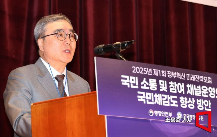 권혁주 한국행정연구원장이 27일 서울 종로구 정부서울청사 별관에서 열린 2025년 제1회 정부혁신 미래전략 포럼에 참석, 발언을 하고 있다.