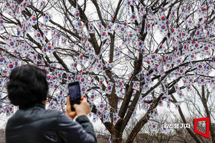 제106주년 3.1절을 하루 앞둔 28일 서울 용산구 효창공원 인근 나뭇가지에 태극기가 걸려 있다.