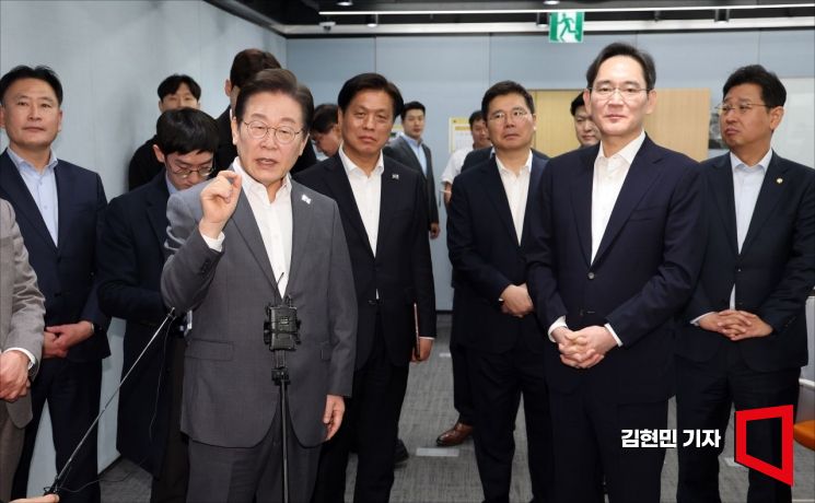 이재명 더불어민주당 대표와 이재용 삼성전자 회장이 20일 오전 서울 강남구 역삼동 삼성 청년 소프트웨어 아카데미(SSAFY)에서 열린 '청년 취업 지원 현장 간담회'를 마친 뒤 아카데미를 둘러보고 있다.