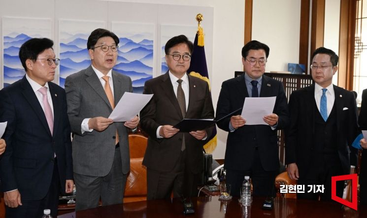 우원식 국회의장과 권성동 국민의힘 원내대표, 박찬대 더불어민주당 원내대표가 20일 국회 의장실에서 국민연금 개혁안 합의문을 발표하고 있다. 왼쪽부터 국민의힘 박형수 원내수석부대표, 권성동 원내대표, 우원식 의장, 더불어민주당 박찬대 원내대표, 박성준 원내수석부대표.