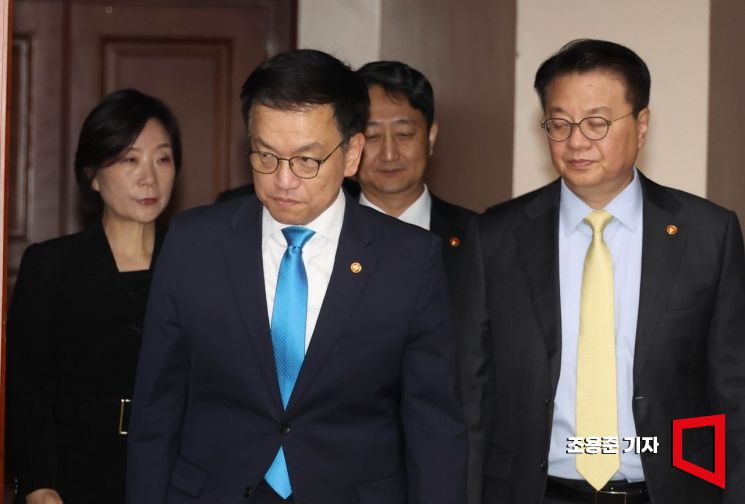 최상목 경제부총리 겸 기획재정부 장관이 9일 서울 종로 정부서울청사에서 열린 경제관계장관회의 겸 산업경쟁력강화 관계장관회의에 참석하고 있다.