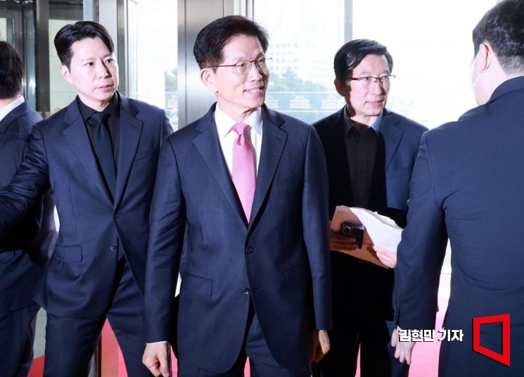 대선 출마를 위해 장관직에서 물러난 김문수 전 고용노동부 장관이 9일 국민의힘 지도부와의 면담 등을 위해 서울 여의도 국회 본청으로 들어서고 있다.