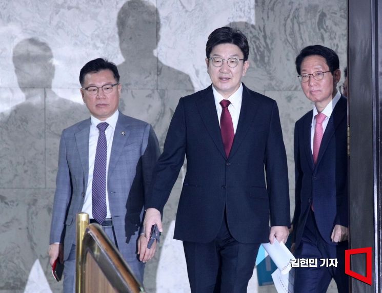 권성동 국민의힘 원내대표가 25일 국회에서 열린 원내대책회의에 참석하고 있다.