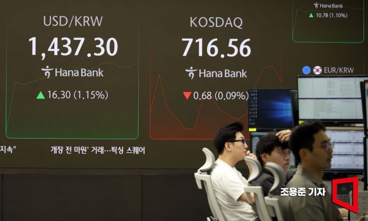 헌정사상 처음으로 대통령 권한대행의 대행의 대행체제가 되면서 국내 경제상황의 불확실성이 커진 2일 서울 중구 하나은행 본점 딜링룸 현황판에 코스피, 원/달러 환율이 표시돼 있다. 이날 코스피는 전장보다 0.09포인트 내린 2,556.52로 원/달러 환율은 15.5원 오른 1,436.5원에 장을 시작했다.