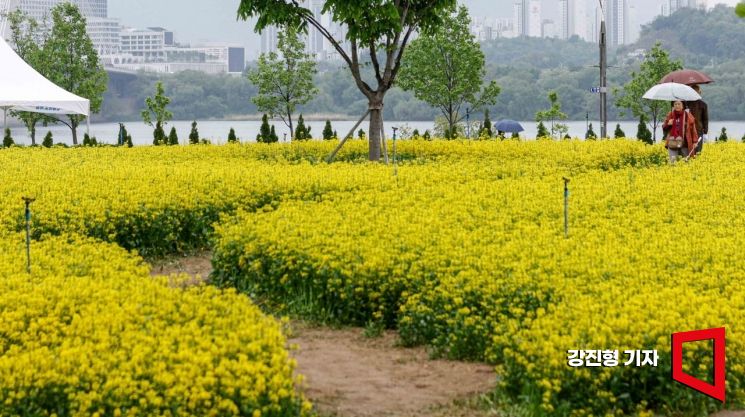 전국 대부분 지역에 비가 내리고 있는 9일 경기 경기 구리한강시민공원에서 열린 '구리 유채꽃 축제'를 찾은 시민이 유채꽃 길을 걷고 있다.